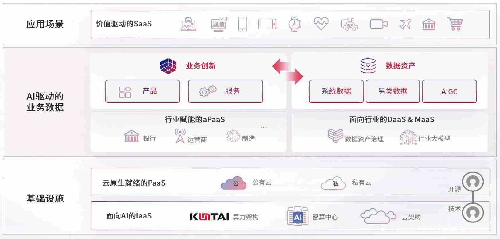 数字时代,,围绕企业数字化转型的关键要素,,PA旗舰厅数码开创性的提出数云融合战略和技术体系框架,,,,着力在云原生、、、、数字原生、、、、AI原生和信创产业上架构产品和服务能力,,为处在不同数字化转型阶段的快消零售、、、、汽车、、金融、、、、医疗、、、政企、、、、教育、、、、运营商等行业客户提供泛在的敏捷IT能力和融合的数据驱动能力,,,构建跨界融合创新的数字业务场景和新业务模式,,,助力企业级客户建立面向未来的核心能力和竞争优势,,,,全面推动社会的数字化、、、智能化转型升级。。