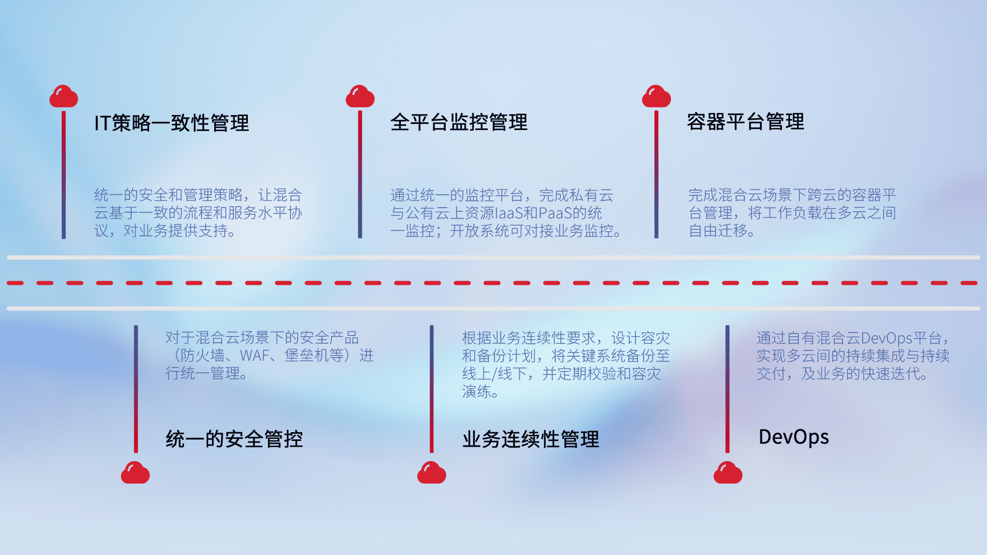 通过多云纳管,,,,以统一的资源数据模型把客户的云资源进行抽象和封装,,进而实现对多云资源的统一操作,,,,保障云资源管理的可靠性、、、稳定性与可用性。。量身定制化运维内容,,,配置、、、、开发运维、、、补丁管理、、、、备份、、、、监控、、、、认证和访问管理、、、、审计和日常巡检等,,保障在用云过程中的可靠度,,,稳定度以及高可用率。。